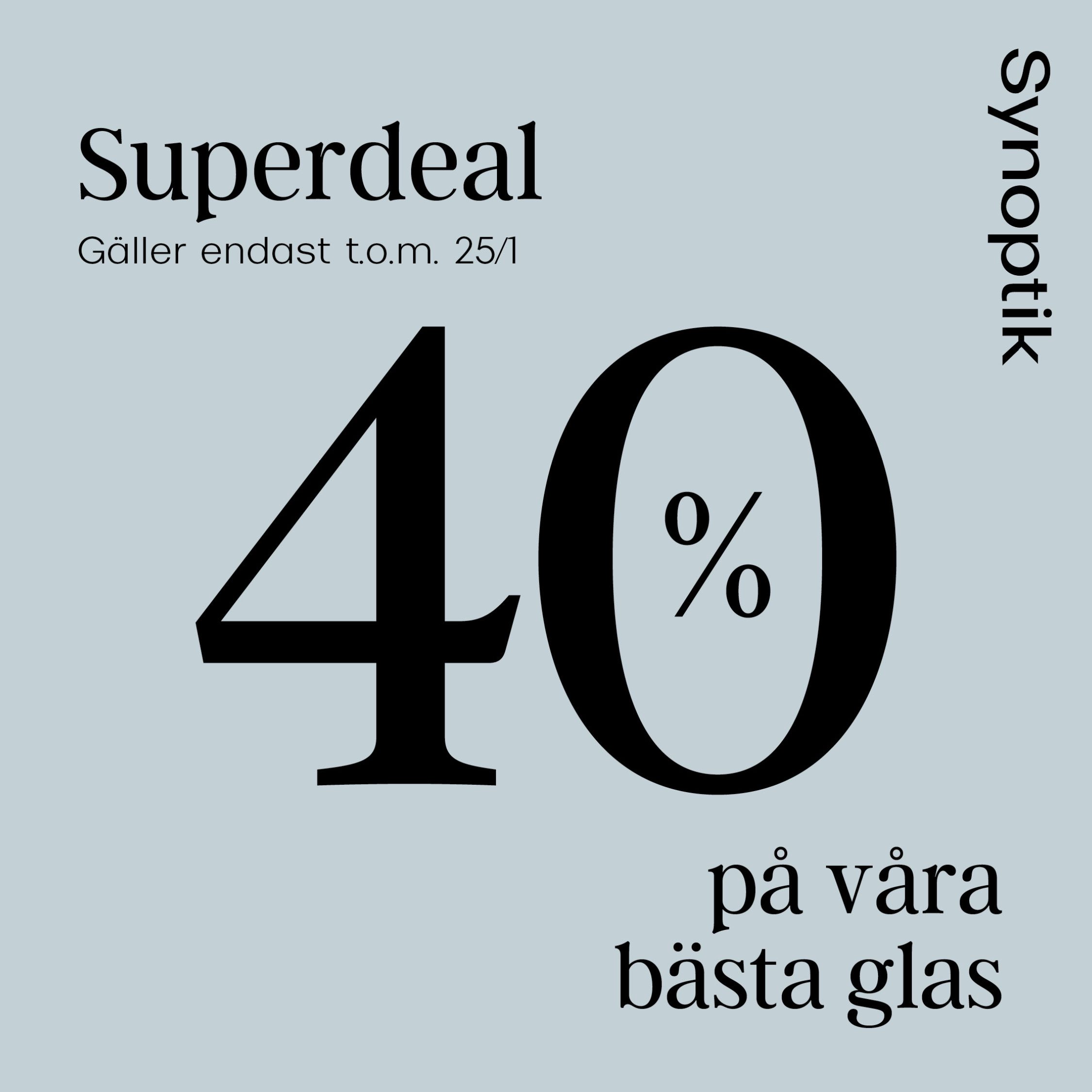 Superdeal: få hela 40 % på våra bästa glas – passa på att fynda favoriter till ett riktigt bra pris under kampanjveckan. Gäller 19-25 januari hos Synoptik.
