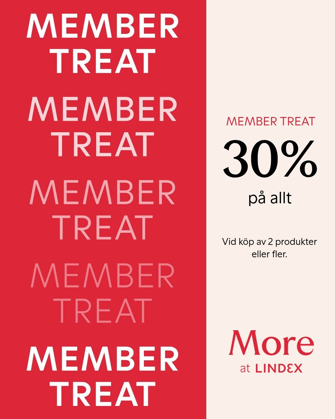Mysigaste högtid är här och med den kommer din medlemstreat. Nu får du som More at Lindex-medlem 30% på allt. Unna dig själv något fint, eller börja bocka av julklappslistan. Gäller vid köp av 2 eller fler produkter t.o.m. 1/12 från hela vårt sortiment för dig som är eller blir medlem. Läs villkor i appen eller på lindex.com.