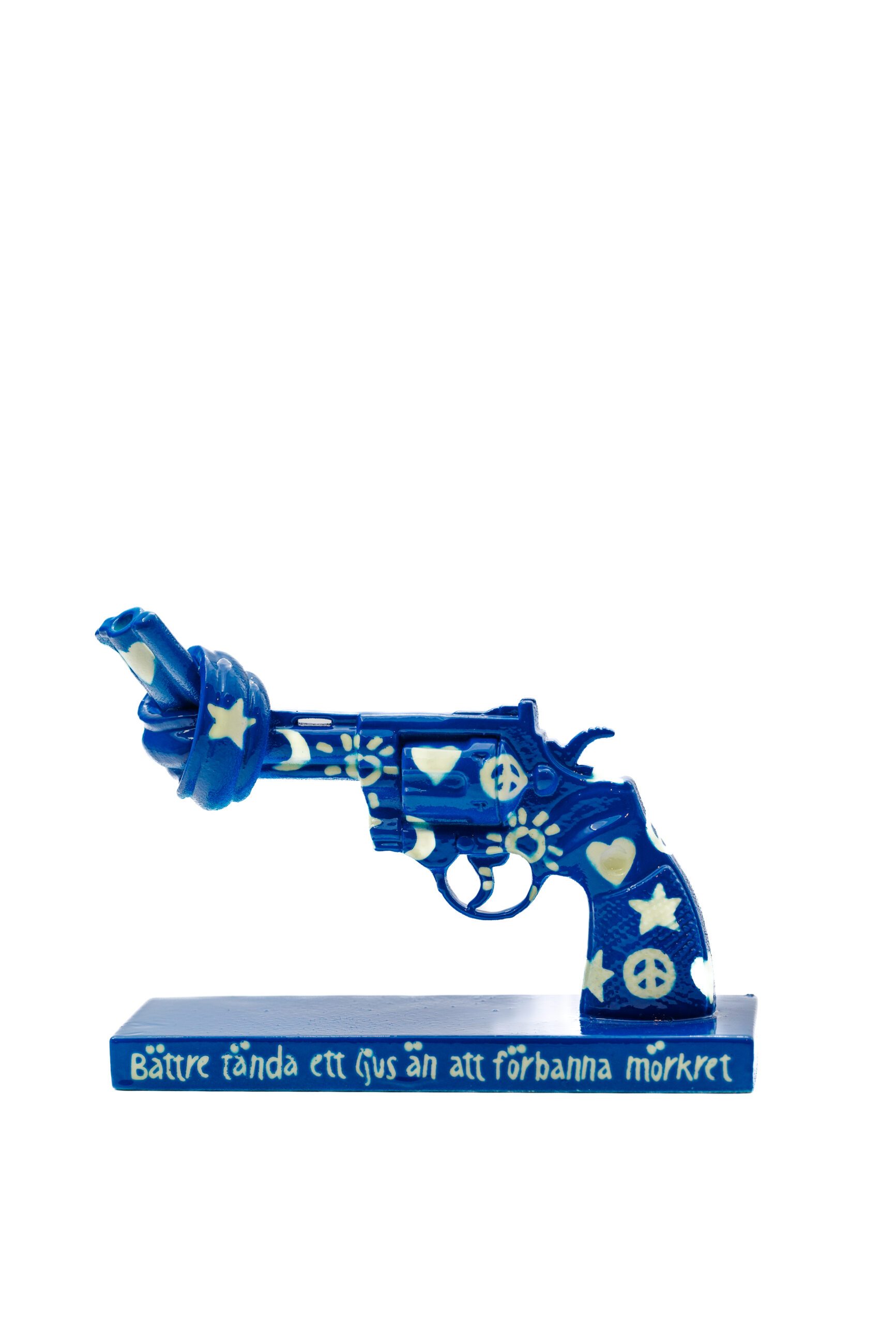 Inspirerad av Konfucius citat ”Bättre tända ett ljus än att förbanna mörkret” har Lasse Åberg skapat en självlysande tolkning av The Knotted Gun – ett konstverk som sprider både ljus och hopp.