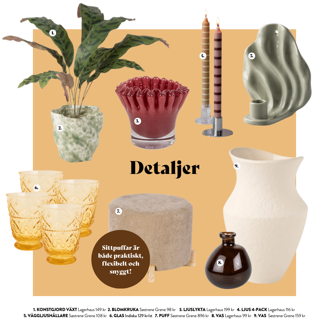 Byt ut lampskärmar, ställ fram en ny ljuslykta eller addera en vas i höstens färger. Små förändringar ger stor effekt.