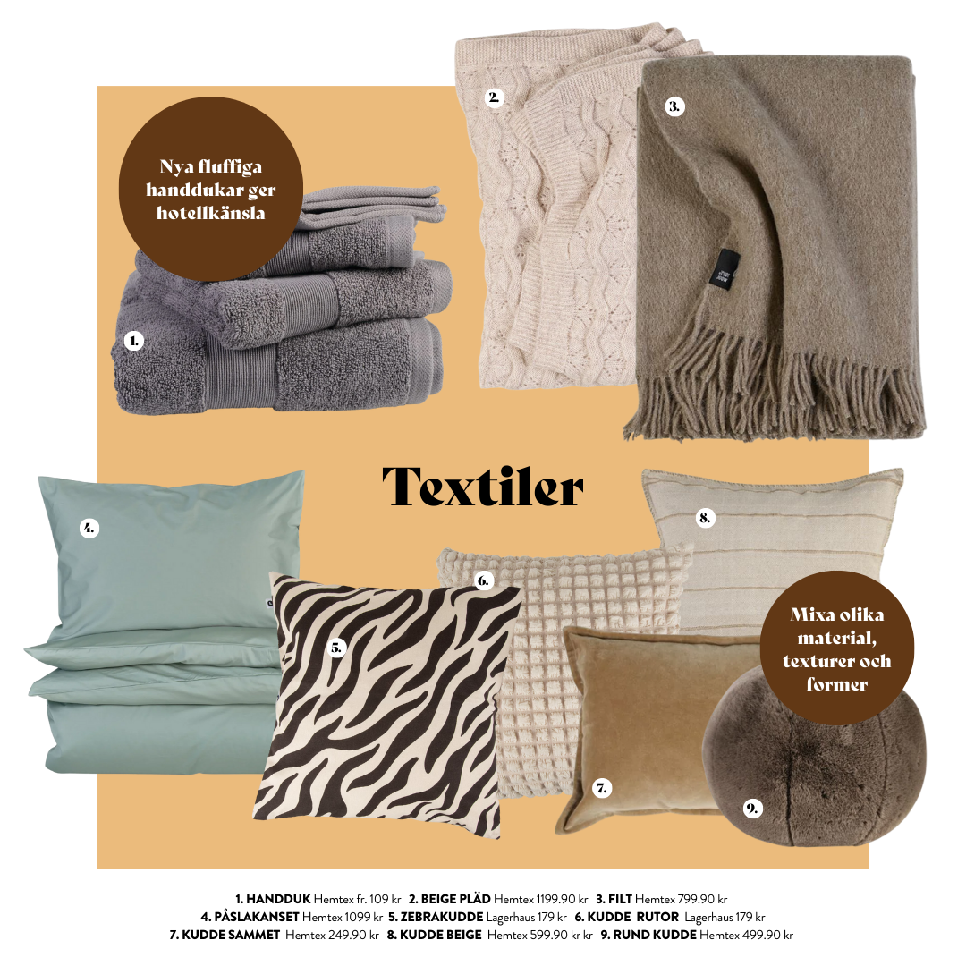 Blanda plädar, kuddar och mattor i olika material och strukturer. Sammet mot linne, stickat mot ull – ju fler kontraster, desto mer ombonat.