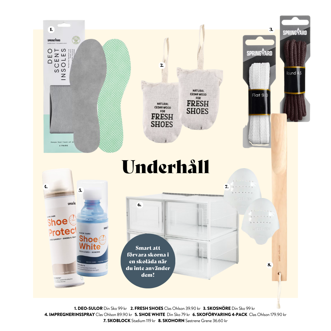 Fräscha skosnören, nya innersulor och doftpuckar gör stor skillnad – både för känslan och hållbarheten. Små detaljer som får skorna att kännas som nya längre.